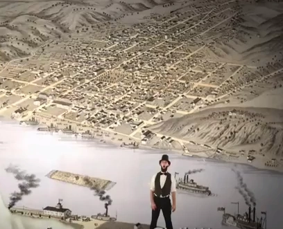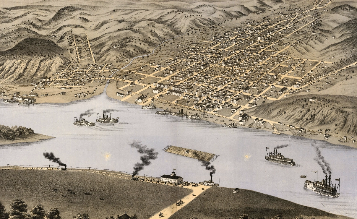The location is a map of the town of Hannibal, Missouri from the year 1869. There are many houses and a nearby river, which has some steamboats in it. Due to Chuck Norris' size in the scene, it is seen from a bird's eye view to demonstrate his size. Hannibal itself is a city in Marion and Ralls counties in the U.S. state of Missouri. It is commonly known as the place where Mark Twain spent some of his life growing up.