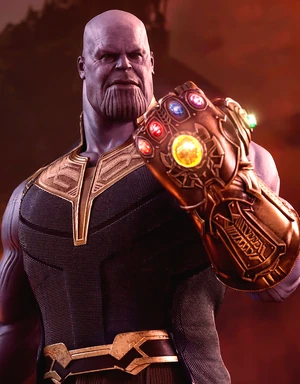 Born on the planet Titan, Thanos was almost killed by his own mother who foresaw his destiny of wielding the Infinity Gauntlet, which allows the Infinity Gems (Power, Mind, Space, Soul, Time, and Reality), to be used together to whatever end its user wills, effectively granting omnipotence. For Thanos, this was used to kill half the population of the universe in order to impress the female personification of Death, with whom he is obsessed.