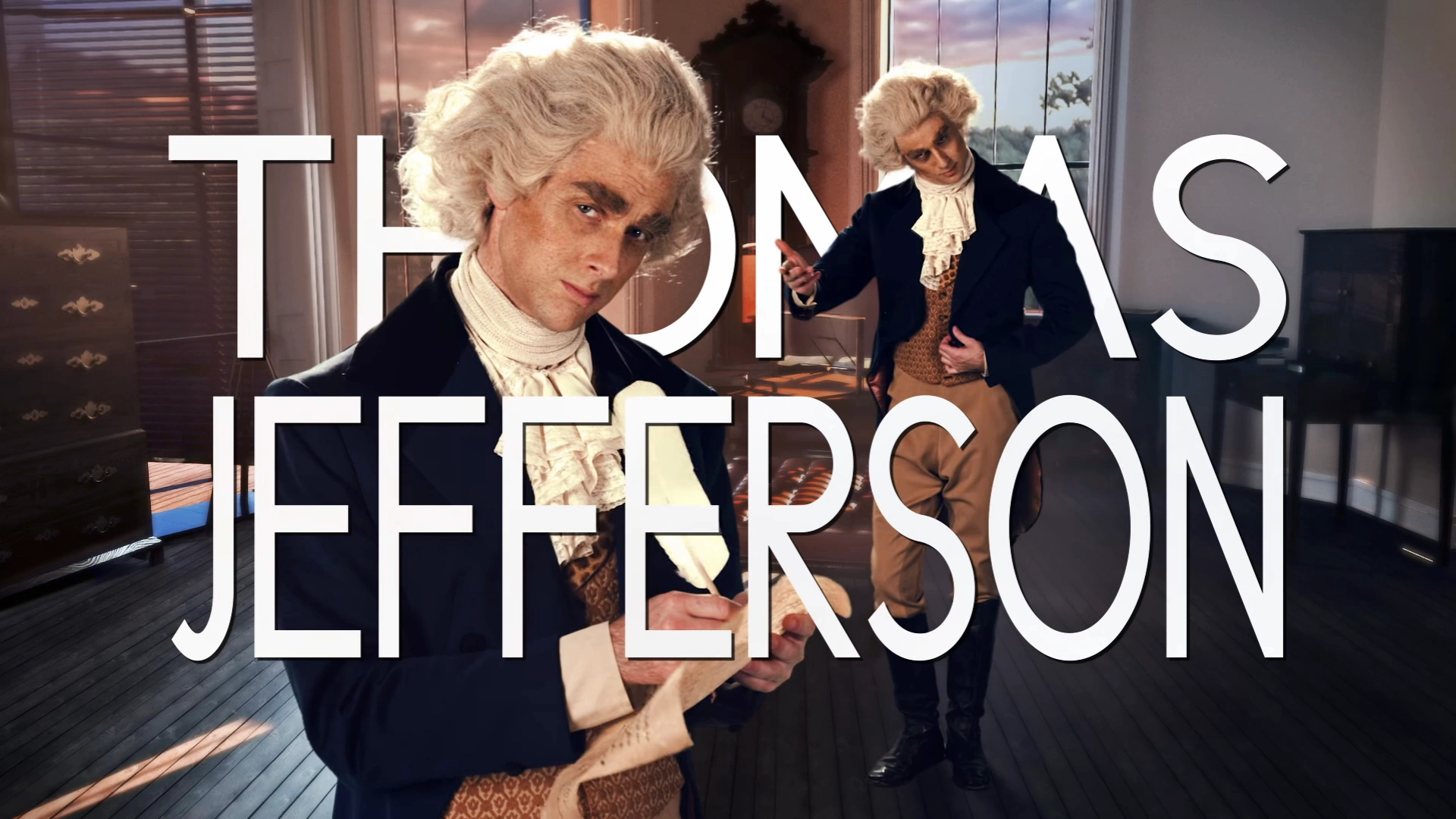 Jefferson, alongside George Washington and Abe Lincoln, briefly appeared when Winston Churchill said, "But if Rushmore was a band, then you'd play bass!", playing drums in their fictional band.